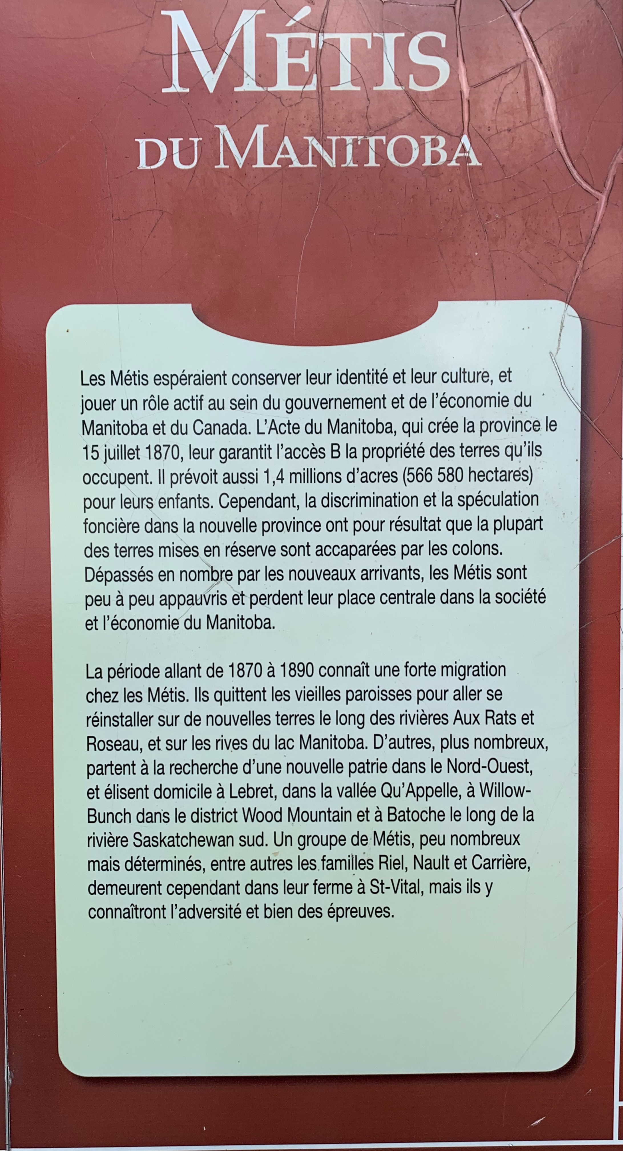 On ne peut pas être à cet endroit sans avoir un grand serrement de cœur, pas tant en raison des rappels historiques à l’entrée du site ou des jeunes interprètes en costume d’époque qui trainent nonchalamment autour du terrain, qu’à cause du sentiment profond de pénétrer dans un lieu sacré, comme une grande cathédrale gothique, un lieu qui a traversé le temps pour te parler à l’oreille. Louis Riel n’a peut-être pas imprégné ces murs du son de ses paroles, mais ils n’en portent pas moins le symbole d’un moment important de notre histoire collective en tant que Canadiens.