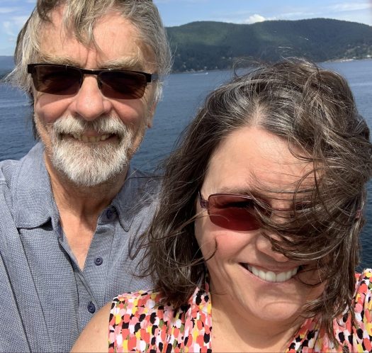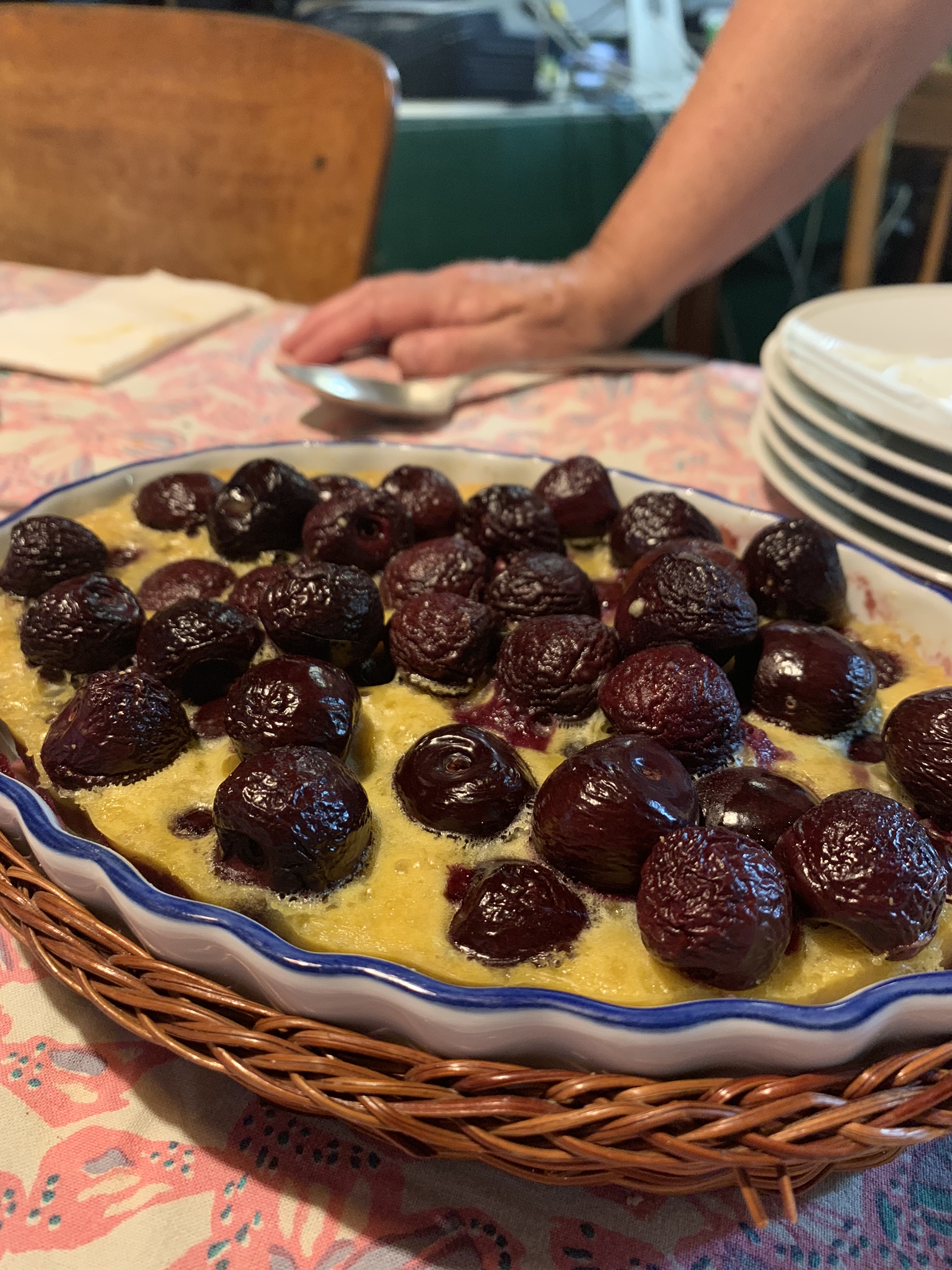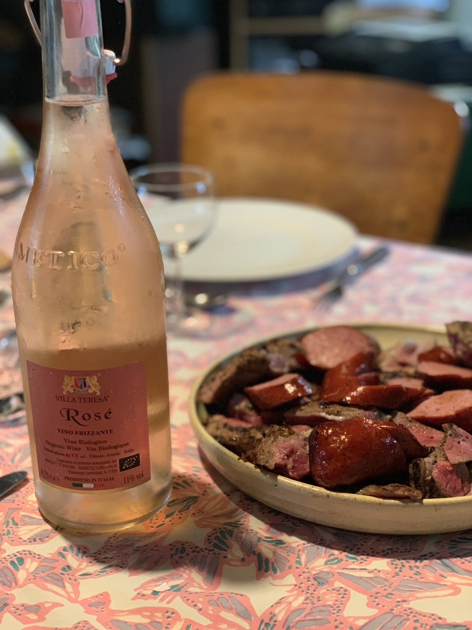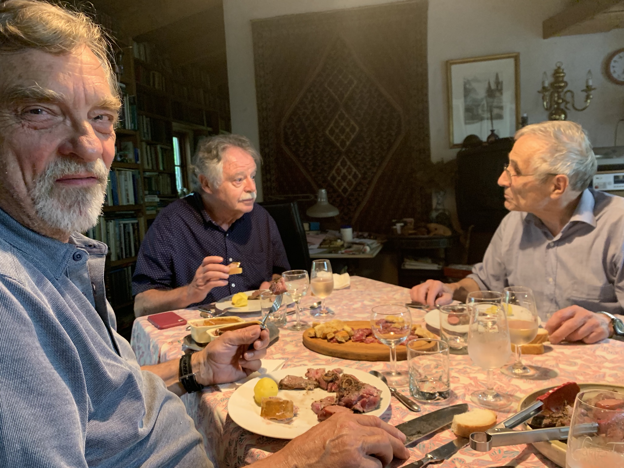 Qu’à cela ne tienne. Bien protégés et des chèvres et des regards des croquants, nous avons improvisé un délicieux repas en compagnie de notre ami Christian qui avait fait le voyage à partir du Mainland pour être avec nous : des steaks d’agneau marinés aux fines herbes, saisis aux bbq; des pâtés, un aux champignons et l’autre à l’orange; des saucisses de canard, grillées au bbq; une salade verte aux tomates et une baguette, française comme il se doit. Il nous restait aussi de délicieux feuilletés au fromage qu’Anne avait concoctés la veille et que nous avions entamés au lunch. Aie-je parlé du clafoutis qu’Anne avait confectionné pour l’occasion… avec de la crème fouettée. Hon, un péché! On a arrosé tout ça d’un délicieux rosé pétillant (Villa Theresa, d’Italie) et d’un bon rouge de la vallée de l’Okanagan (Diabolica). Ça c’est de l’amitié!