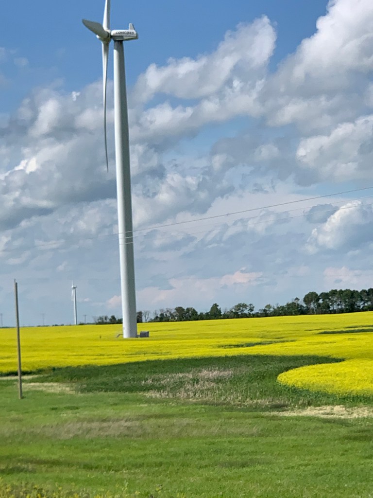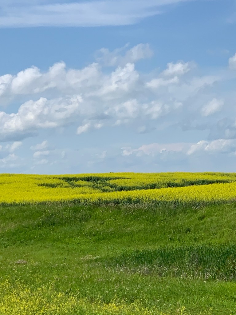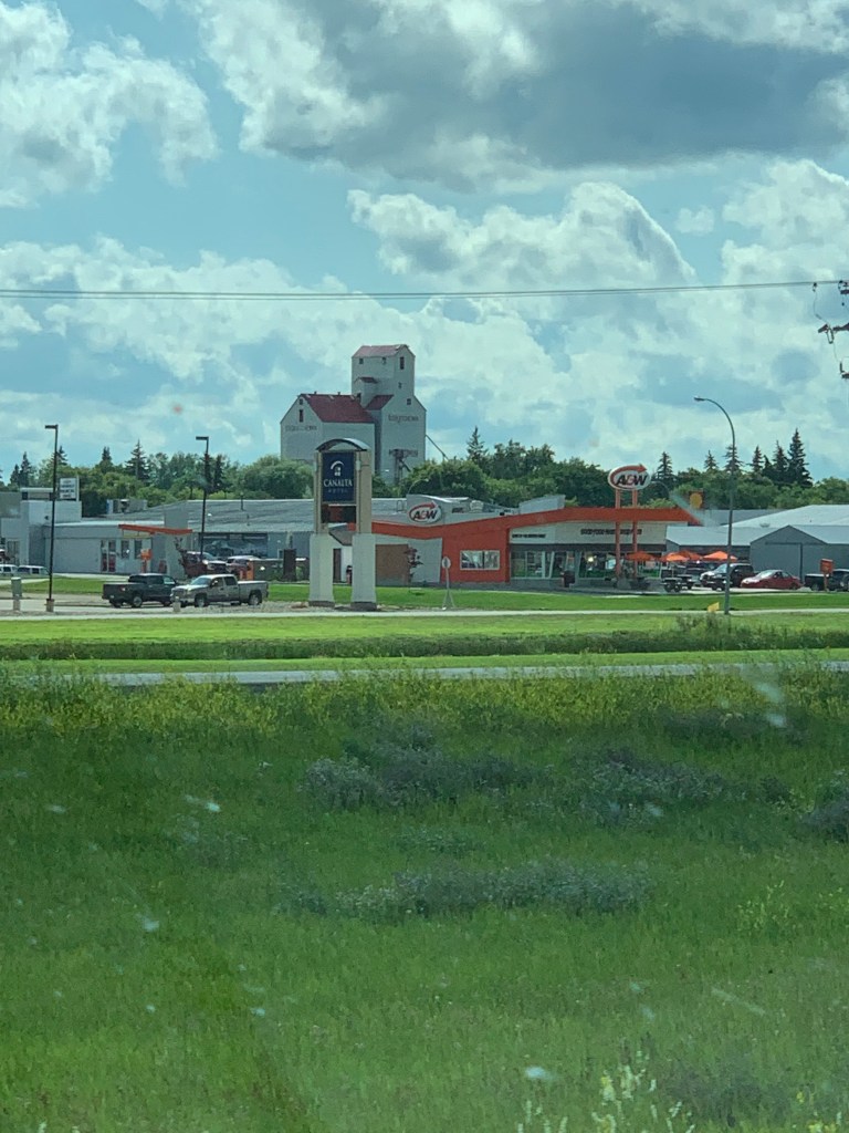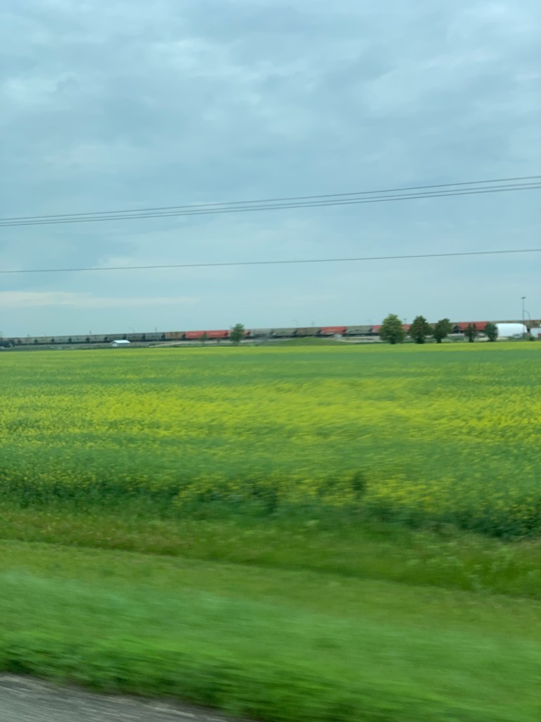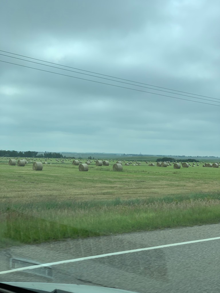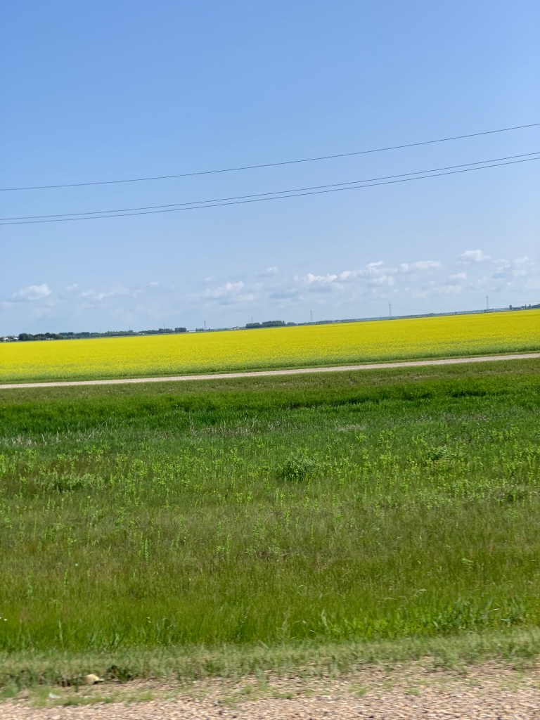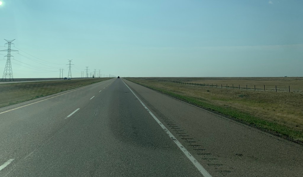 Quand on conduit sur ce long long long ruban d’asphalte qui s’étend à perte de vue sur l’horizon, on a l’impression d’être comme un capitaine au long cours qui ne touche pratiquement plus au gouvernail et qui scrute au loin la côte qui se fait distante. Rien pour retenir le regard sinon les oiseaux, les pizzas sur l’accotement, l’étendue infini tantôt de canola, tantôt de blé ou encore tantôt de luzerne. Chaque culture couvre des kilomètres. Une ferme, comme une île lointaine, apparaît de temps à autre avec ses immenses silos. On imagine la machinerie monstrueuse qu’il faut utiliser pour labourer des espaces aussi titanesques.