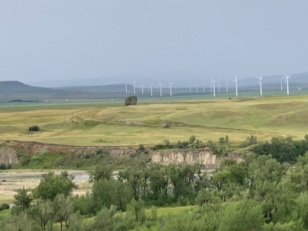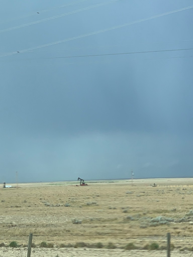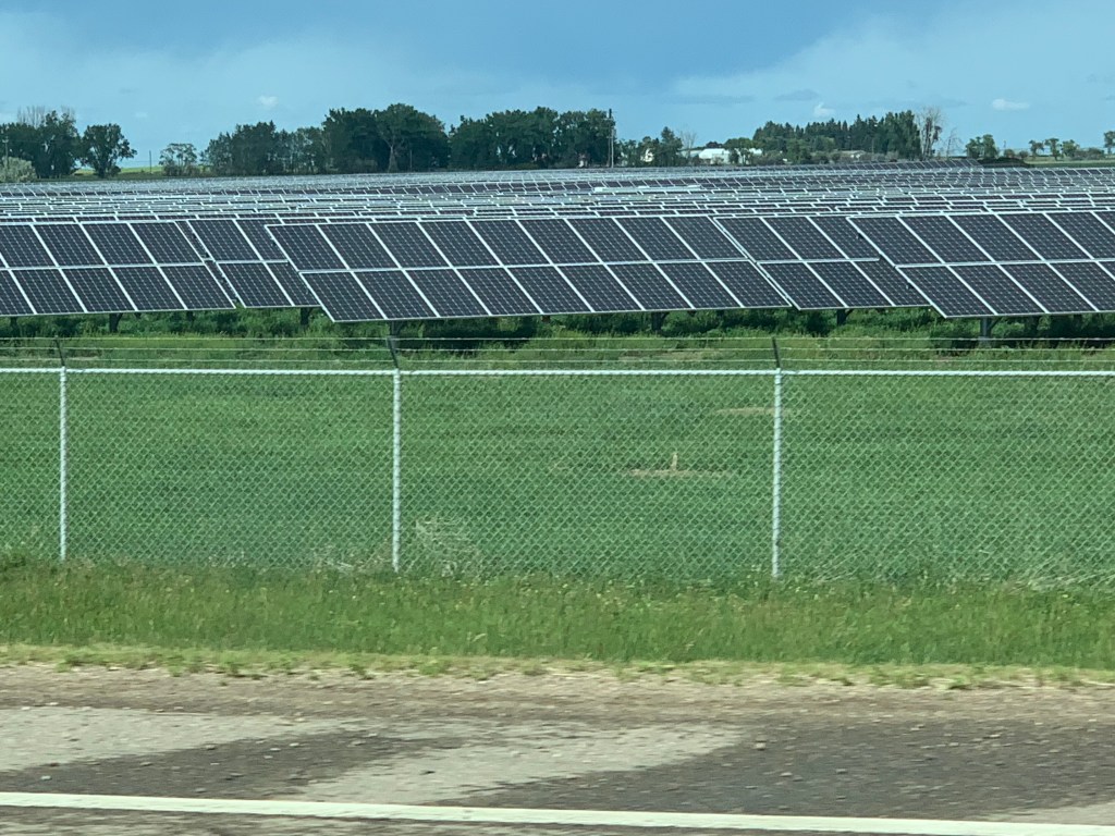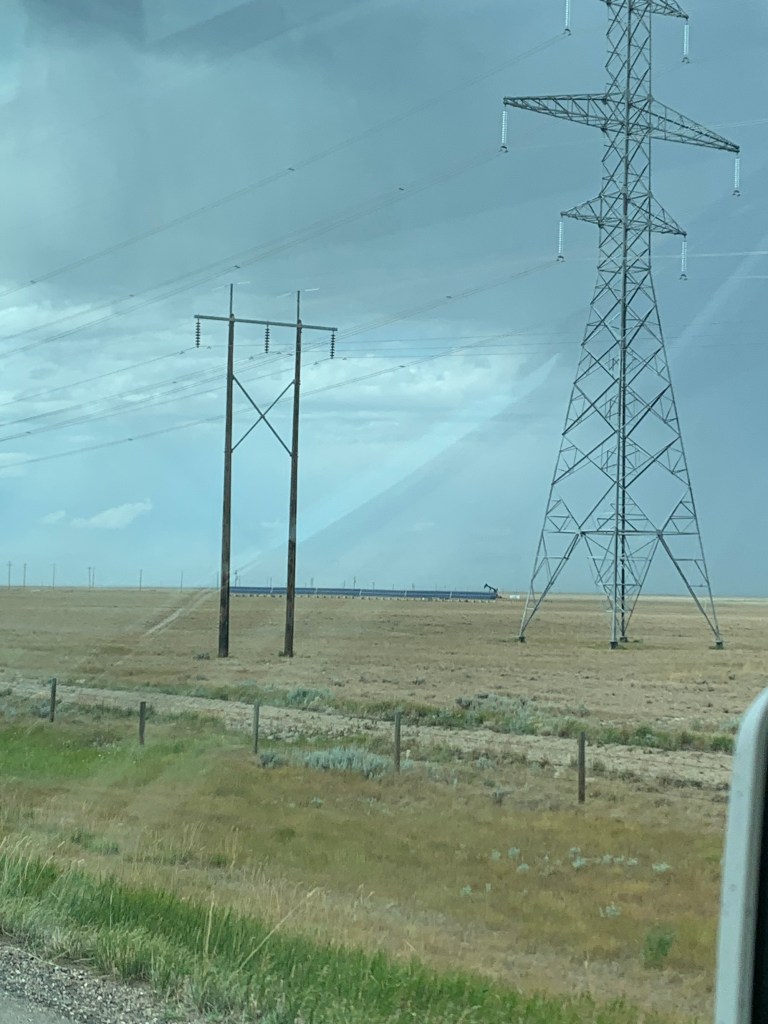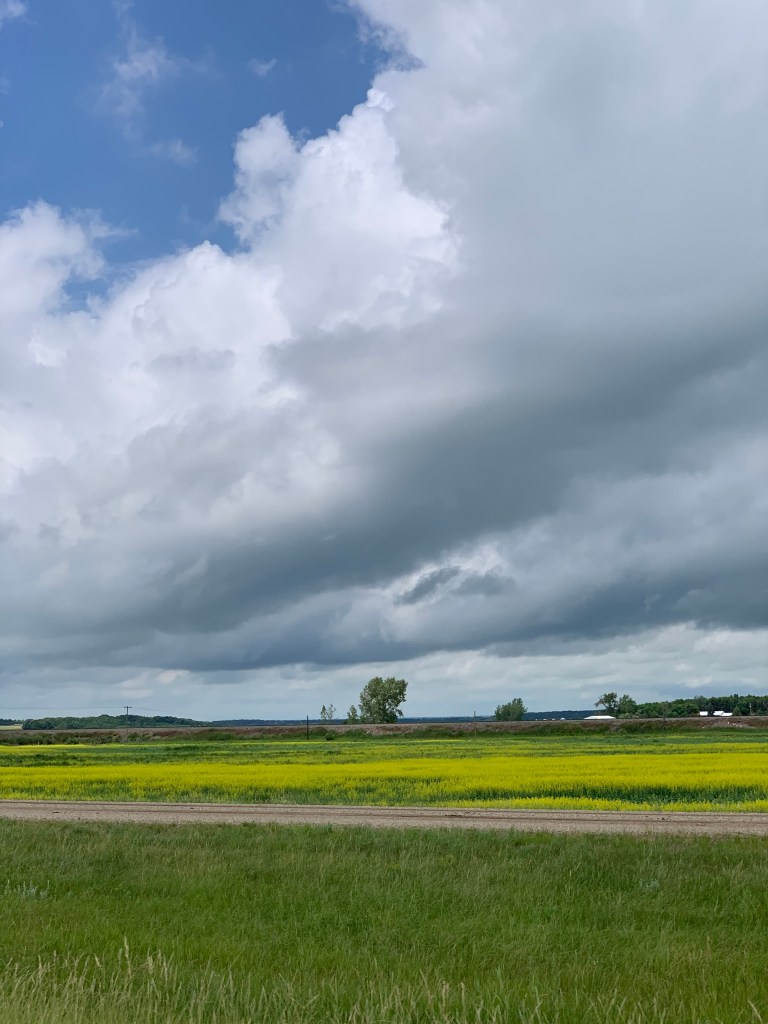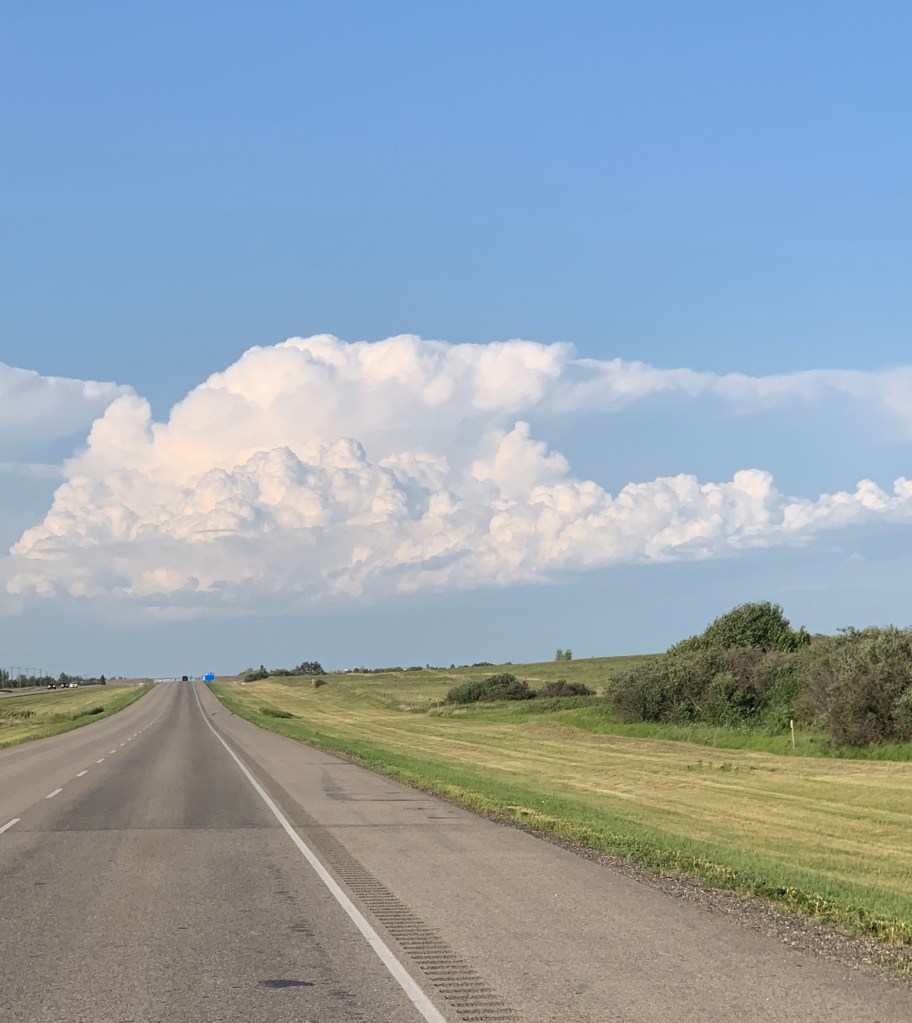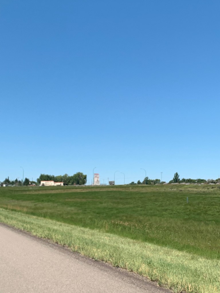 Quand on conduit sur ce long long long ruban d’asphalte qui s’étend à perte de vue sur l’horizon, on a l’impression d’être comme un capitaine au long cours qui ne touche pratiquement plus au gouvernail et qui scrute au loin la côte qui se fait distante. Rien pour retenir le regard sinon les oiseaux, les pizzas sur l’accotement, l’étendue infini tantôt de canola, tantôt de blé ou encore tantôt de luzerne. Chaque culture couvre des kilomètres. Une ferme, comme une île lointaine, apparaît de temps à autre avec ses immenses silos. On imagine la machinerie monstrueuse qu’il faut utiliser pour labourer des espaces aussi titanesques.