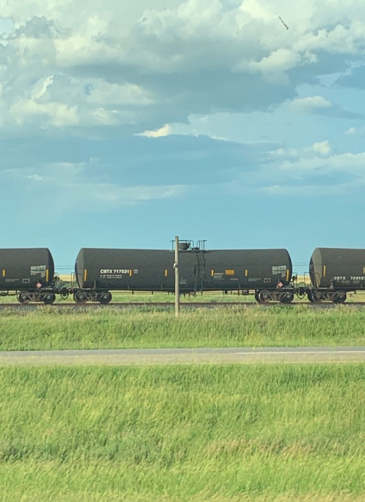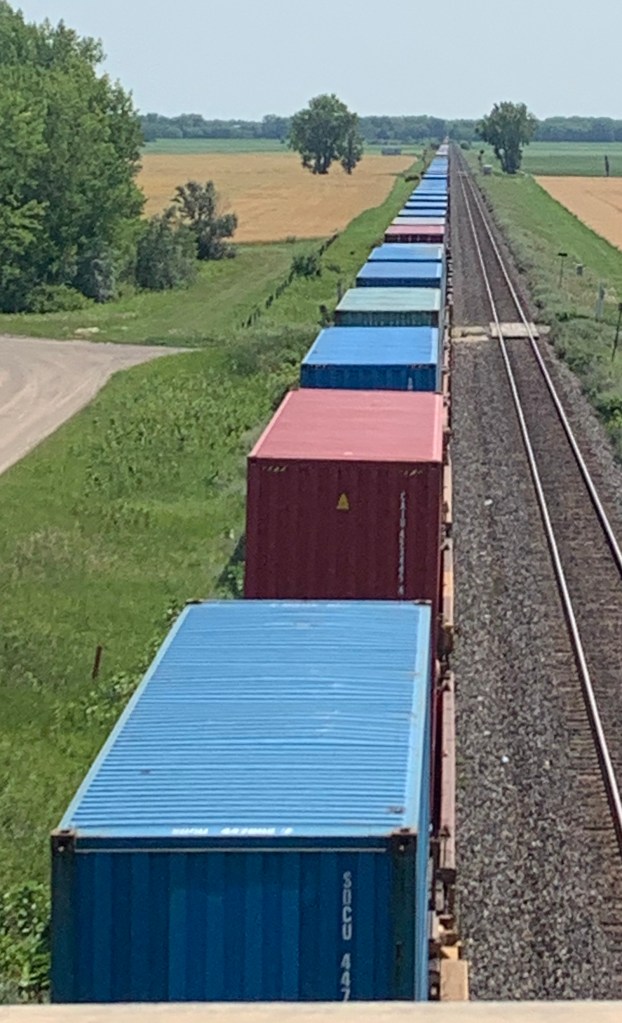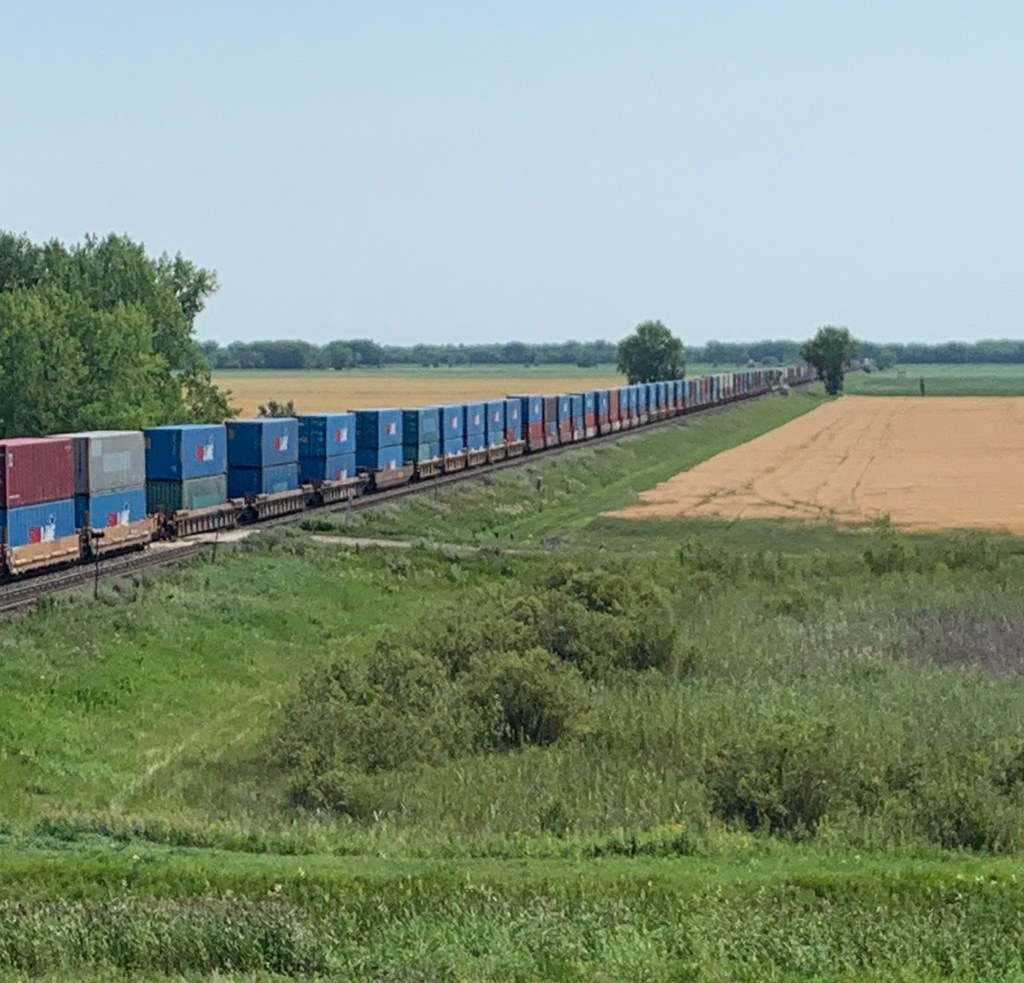 De temps à autre, une chenille immense serpente sur ses rails invisibles dans les blés. Des centaines de wagons, parfois étirés sur plus d’un mille derrière leurs locomotives forment pendant quelques minutes, un mur dans la plaine, une barrière trompienne entre ce qu’on peut voir et l’infini qui continue ensuite.