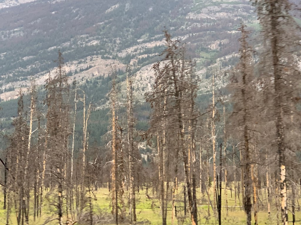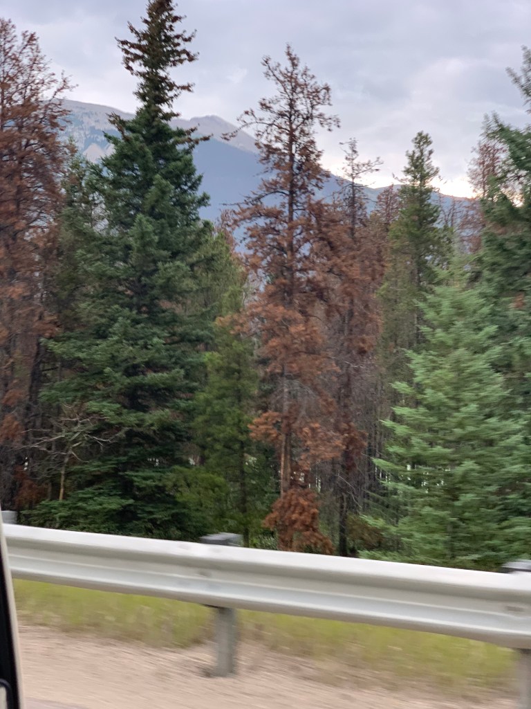 Tiens, une surprise : un boisé et sa faune. On doit approcher de l’Ontario. Au moins, ici, les arbres ne sont plus menacés par les insectes carnivores (dendroctones) qui ravagent les forêts de l’Ouest. Le jaune orange n’est vraiment pas une belle couleur dans le bois.